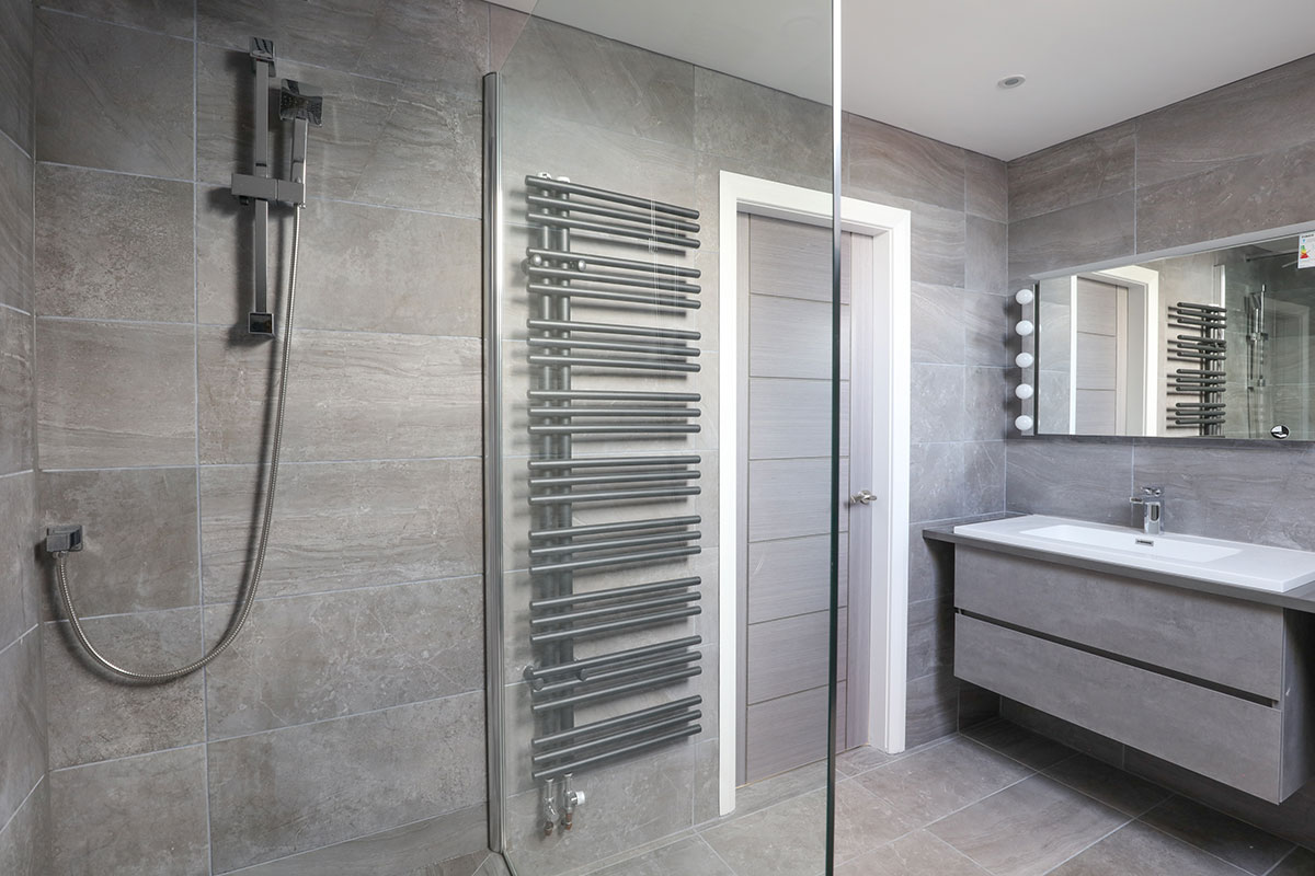 Innovative design coupled with quality materials. This latest project boasts Roca L90 chrome taps that combine quality and style. The space is fully coated in oversized porcelain matte grey tiles and graphite grout, creating that urban minimalist appeal. The central feature of the space is the Ella LED mirror, complete with Infra red sensor, demister pad and shaver socket. Polished practicality at its best.